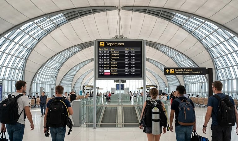 As Southeast Asia's major travel hub, arriving in Bangkok gives you multiple options to reach us. From Suvarnabhumi (BKK) or Don Mueang (DMK), you can easily book connecting flights to Koh Samui, Chumphon, or Surat Thani. If you prefer a more traditional and scenic travel experience, you can book a combined ticket from Bangkok that includes an overnight sleeper train or VIP coach down to Chumphon, perfectly timed to connect with the morning ferries crossing over to Koh Tao.